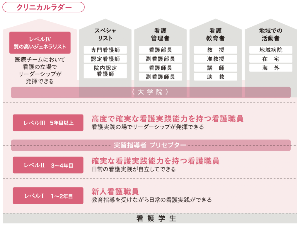 専門職業人としての自己啓発・自己研鑽のために研修機会を自ら選択し、常に目標を持ち、主体的に学習していくことが基本です。看護部キャリアパスは全看護職員を支援します。