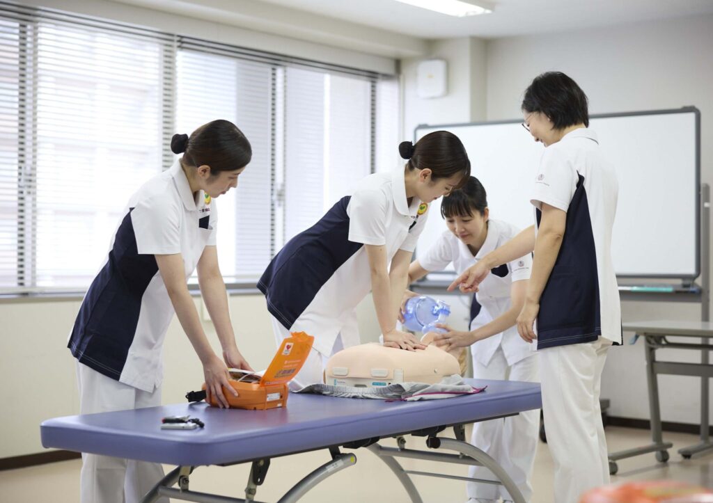私たちは年間を通して院内研修会の企画・運営を行っています。看護実践研修では専門・認定看護師や院内認定看護師、各部署の教育担当者等が講師・指導者となり、少人数制で丁寧な指導を行なっています。集合研修はもちろん、少人数で受講できるシミュレーショントレーニングも実施しており、看護職員全員で新人看護職員のサポートを行なっています。研修後の受講者と指導者の笑顔と新人看護職員の成長が、私たちの原動力になっています。