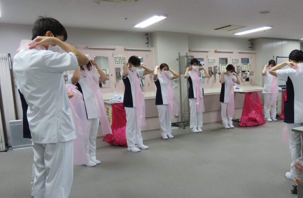 - 職業感染防止:全職員に対して、職業感染防技術の教育・指導を行い、評価する。