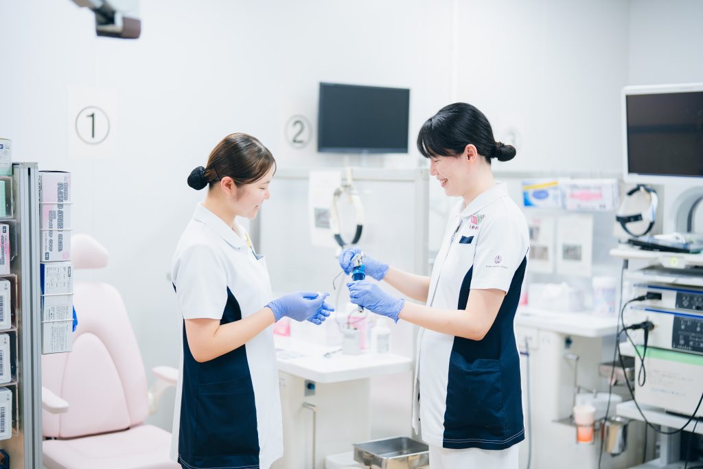 日々の業務は、パートナーシップ・ナーシングシステムに基づき2人1組で行動します。先輩看護師とともに看護ケアを行っていくので安心して看護を提供することができます。また、2人1組で患者さんと関わるため、ペアの看護師がどのように患者さんとコミュニケーションをとっているか、何を観察しているかなど学べます。