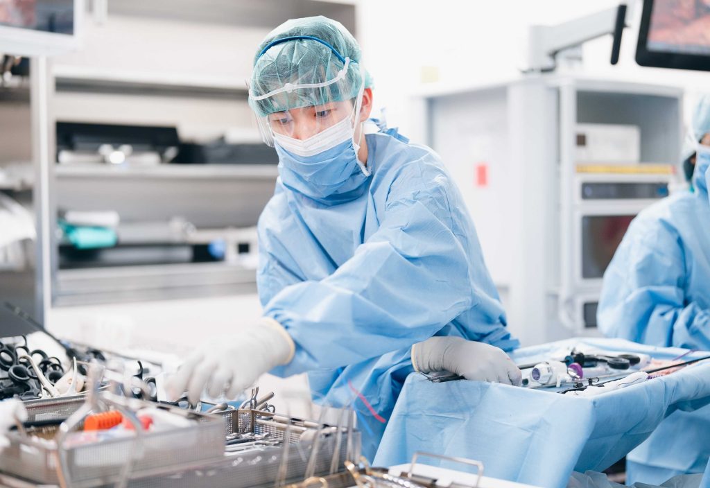 手術室の看護は、大きく器械出し看護と外回り看護に分かれます。器械出し看護は、滅菌された器械を清潔操作で準備を行い、患者さんの手術に応じ、直接的に手術介助を行う看護です。外回り看護は、患者さんに寄り添い、患者さんの尊厳を大切に考えることが重んじられます。手術中の体位の調整や褥瘡予防など幅広い専門的知識や技術を手術チームメンバーと協働して提供しています。